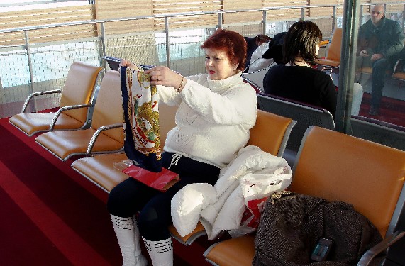 По мере приближения к аэропорту погода всё более налаживалась. А когда мы, пройдя все положенные процедуры, разместились в огромном зале с высоченными полукруглыми потолками, солнце светило во всю. Настроение у нас было хорошее. Оставив сумку, которую брали в салон, мы по очереди сходили «потратить немного денег».
