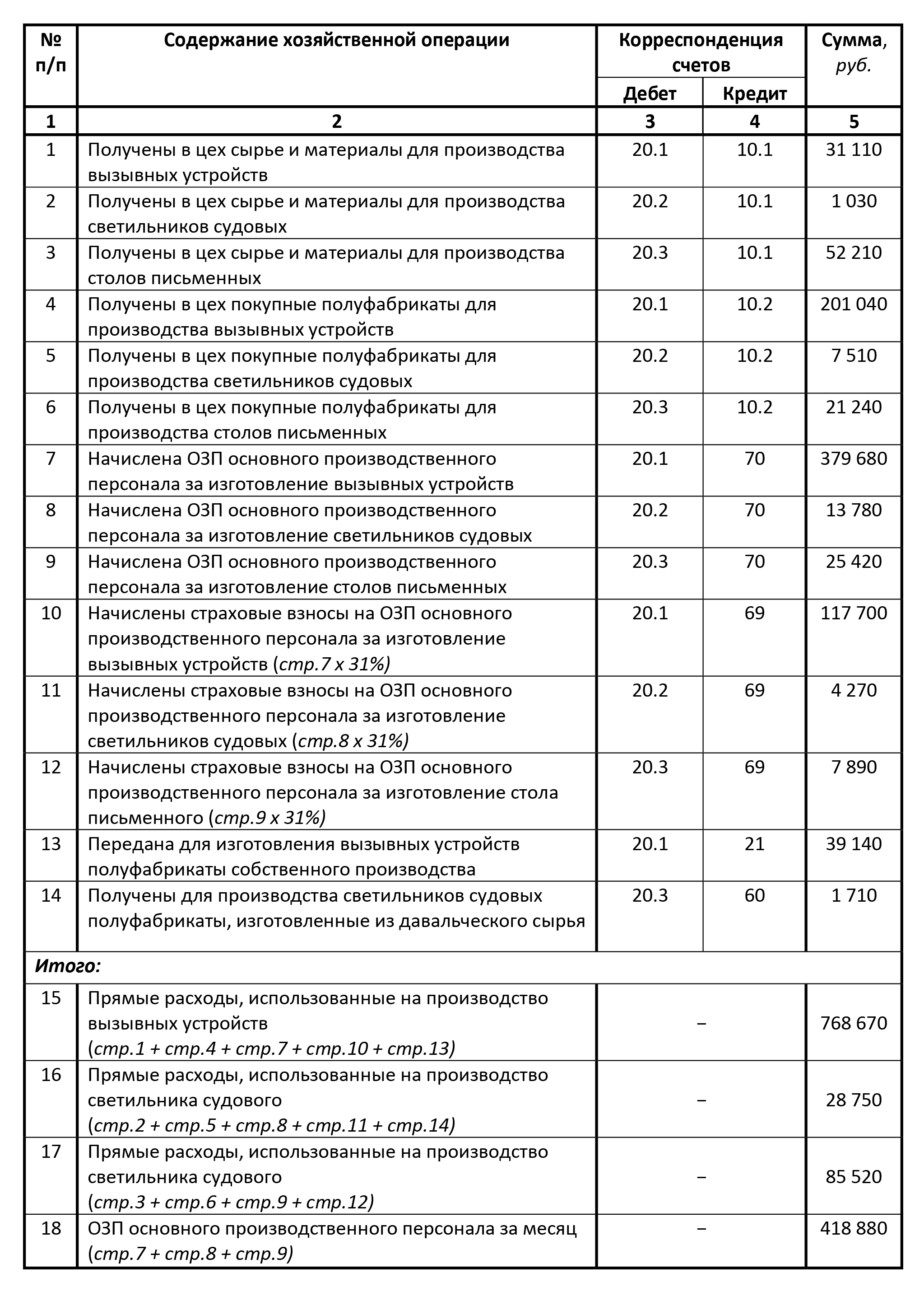 В связи с тем, что остатки НЗП светильников судовых и столов письменных на конец месяца отсутствуют, полная сумма расходов на их производство, как себестоимость готовых изделий учитывается на соответствующих субсчетах счета 40 (стр. 17,18). В свою очередь себестоимость завершенных производством вызывных устройств (стр. 16) определена умножением количества таких изделий на их нормативную себестоимость. Остатки НЗП на конец месяца по вызывным устройствам определяются как сальдо субсчета 20.1 (НЗПк.м. = НЗПн.м. + Рм. – Рг.п.) в сумме 246 130 руб. = 833 240 руб. + 760 280 руб. – 1 347 390 руб.