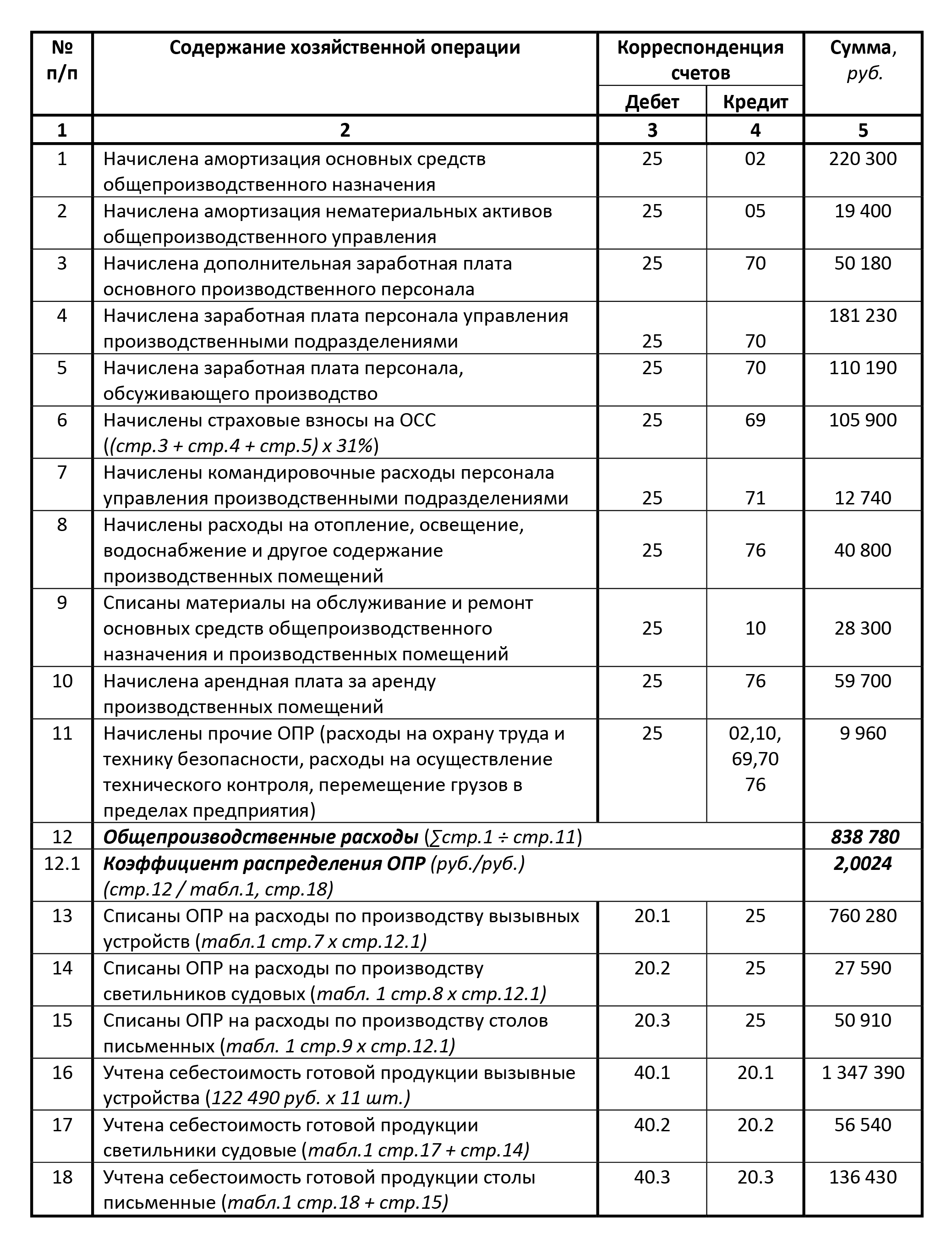 Пример 4. Суммы отдельных видов общепроизводственных расходов, использованных ПАО «Утес» для производства продукции в январе 2025 г., приведены в таблице 2. Учетной политикой предприятия определено, что все ОПР являются переменными косвенными расходами, а базой их распределения установлена ОЗП основного производственного персонала. Для расчета норматива распределения ОПР в примере использована фактическая ОЗП основного производственного персонала за месяц, указанная в таблице 1 стр. 18, в сумме 418 880 руб.