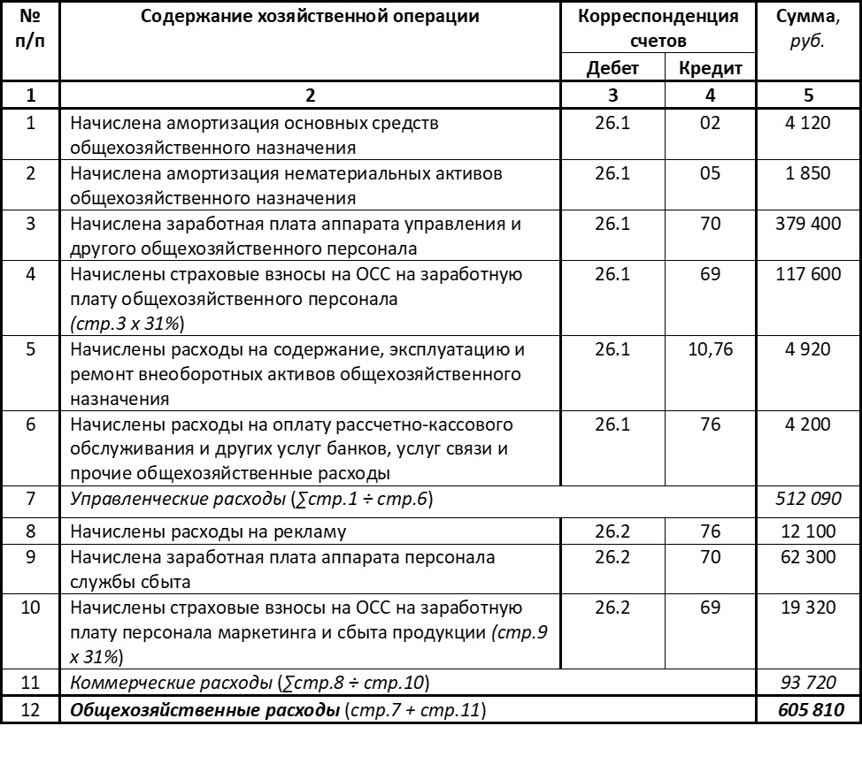 Также, как с прямыми и ОПР в наименовании общехозяйственных расходов точно отражается направление их использования. В этом случае для потребностей управления, непосредственно несвязанных с производственным процессом. Для обобщения информации о них предусмотрен счет 26 «Общехозяйственные расходы», в дебет которого по кредиту соответствующих счетов списываются элементы затрат (материалы, амортизация внеоборотных активов, заработная плата, прочие), использованные в таком направлении.
