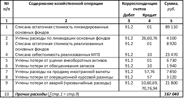 При этом в таблице указаны отдельные операции наиболее типичных направлений использования прочих расходов, ликвидация и другие выбытия основных, реализация запасов, операции с иностранной валютой, чрезвычайные события.