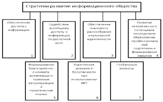 Как очевидно, было названо семь нижеследующих направлений – принципов развития современного информационного общества. Рассмотрим их здесь по порядку.