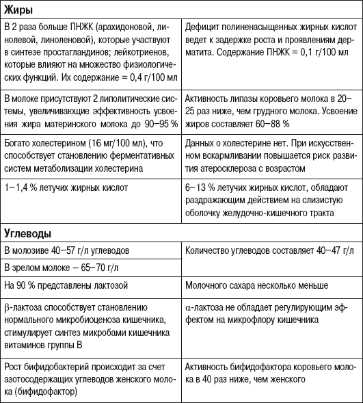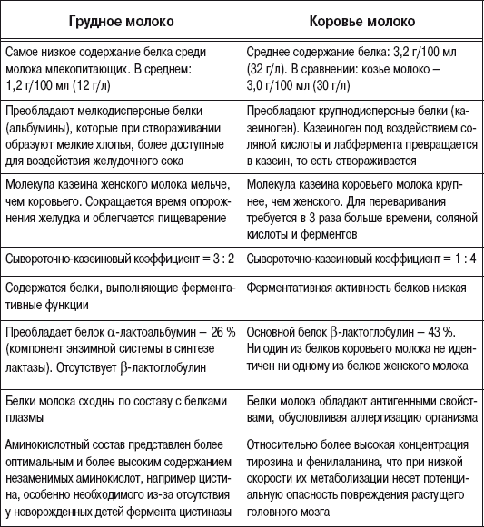 Подтверждение пунктов 1, 2, 4, 5 удачно суммировано в табл. 1, 2, 3 (Макарова В. И., Плаксин В. А. и др., 2005), где представлен сравнительный состав грудного и коровьего молока (наиболее часто используемого для приготовления искусственных смесей).