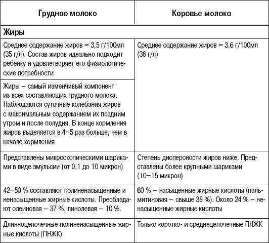 Жиры обеспечивают грудного ребенка энергией (до 50 % энергетической потребности), незаменимыми жирными кислотами, возможностью усваивать жирорастворимые витамины. Жир грудного молока на 98 % состоит из триглицеридов, энергетическая ценность которых в 2 раза превышает таковую белков и углеводов.