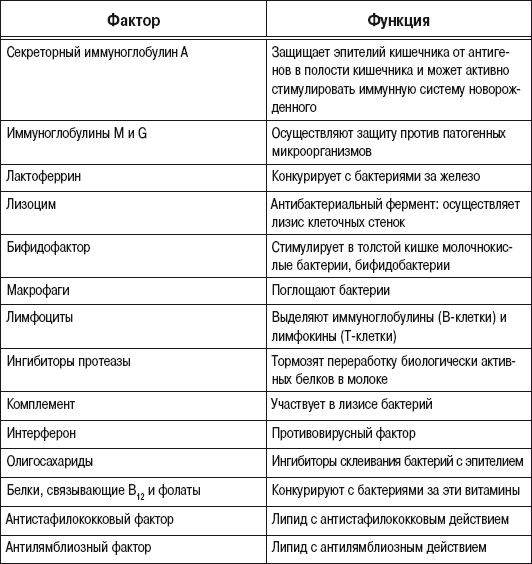 В грудном молоке содержатся иммуноглобулины, лизоцим, лактоферрин, бифидофактор и клеточные компоненты – макрофаги, лимфоциты, нейтрофильные гранулоциты, эпителиальные клетки. Клеточные компоненты помогают предотвратить инфекцию как путем фагоцитоза, так и секреции иммунных веществ, специально «обученных» в организме матери и специфических к определенным микроорганизмам. Фагоцитарная активность макрофагов женского молока осуществляет формирование местного иммунитета в кишечнике ребенка.