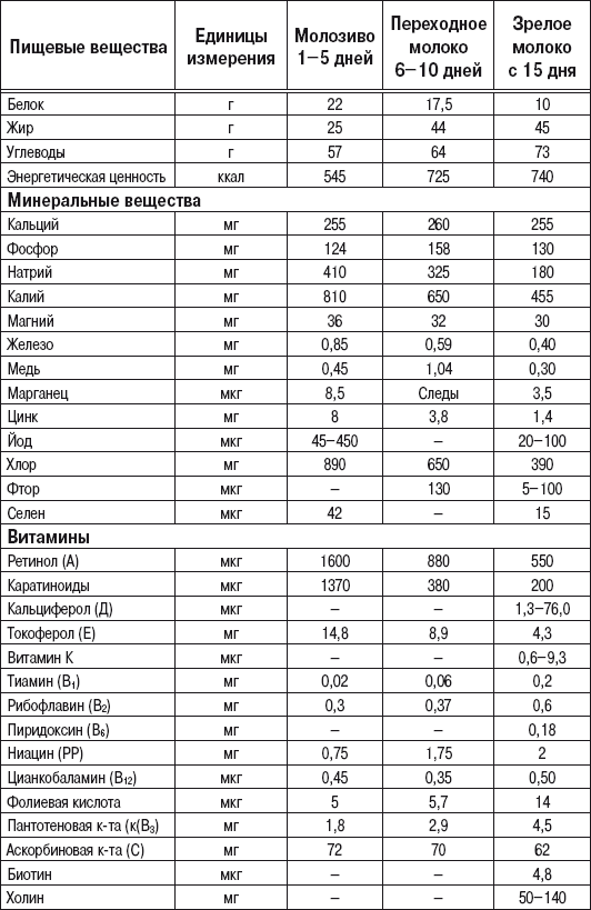 Табличные данные, как правило, не отражают вариабельности состава зрелого молока, который связан с гестационным возрастом ребенка, сроком и объемом лактации, характером питания матери. Например, в раннем лактационном периоде содержание белка 14–16 г/л, к 3–4 мес. оно снижается до 8-10 г/л, а к 6 мес. – до 7–8 г/л.