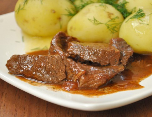говядина – 150 г, лук репчатый – 20 г, томатный соус – 50 г, соль, перец, растительное масло – 4 г.