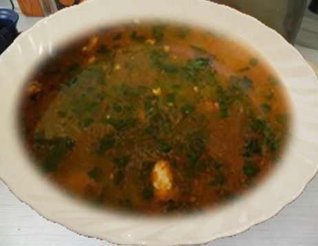 говядина – 50 г, лук репчатый – 15 г, рис –35 г, помидоры свежие – 30 г, зелень (петрушка, укроп, кинза по вкусу) – 10 г, специи: хмели-сунели, базилик, красный молотый перец, чеснок – 5 г, вода – 400 г.