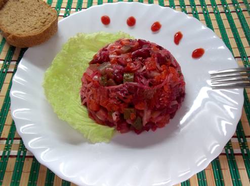 солёные огурцы – 25 г, свёкла – 50 г, яблоки – 30 г, морковь – 25 г, консервированный зелёный горошек – 20 г, масло растительное – 8 г, сок лимона, перец, соль.
