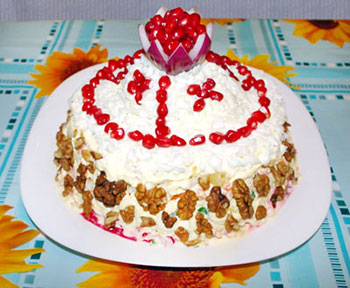 Покройте салат оставшимся картофелем (смешанным с майонезом), формируя горку. Придайте салату форму шапки.