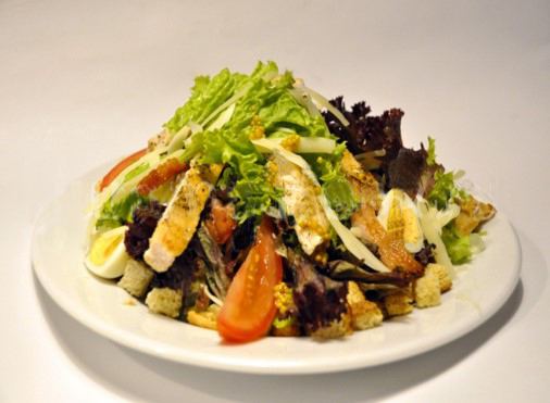 листья салата – 20 г, помидоры свежие – 110 г, сухарики – 30 г, сыр – 10 г, мясо птицы (курица) – 50 г, мясо копчености (бекон) – 35 г, яйцо – 1 шт., масло растительное – 10 г, чеснок – 5 г, соевый соус, горчица.