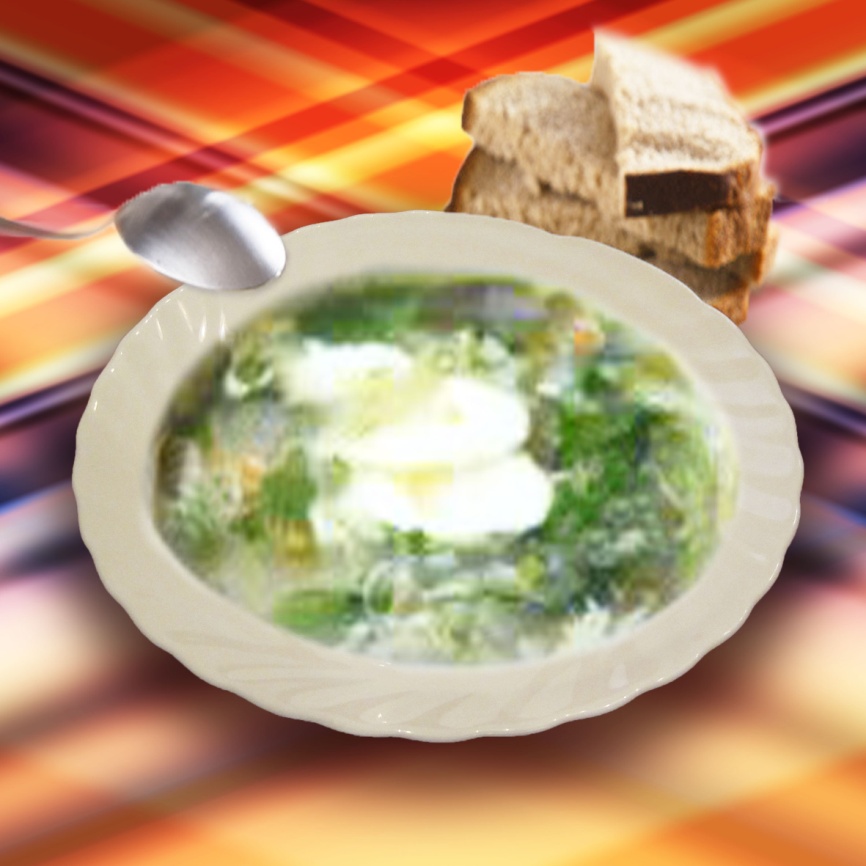 картофель – 100 г, лук репчатый – 10 г, морковь – 15 г, рис – 20 г, щавель – 30 г, зелёный лук, укроп, петрушка – 20 г, яйцо – 0,5 шт., бульон – 450 г, соль, перец по вкусу.