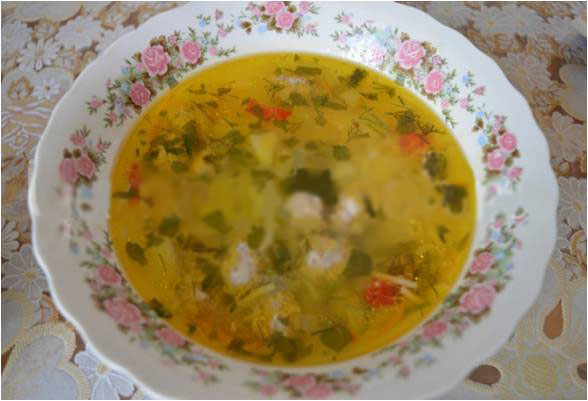 В кипящую воду заложите фрикадельки, когда они всплывут, заложите картофель. Когда вода снова закипит, заложите лапшу, пассеровку, укроп и посолите. Варите при среднем нагреве 15 мин. Отключите нагрев, закройте крышку и дайте постоять 5 мин.