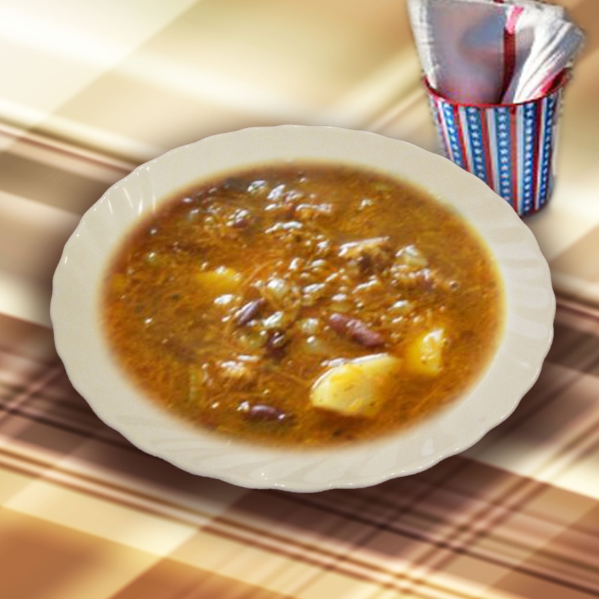 фасоль – 30 г, картофель –100 г, морковь – 15 г, лук репчатый – 10 г, свинина (говядина) – 50 г, масло растительное – 5 г, соль, перец чёрный молотый, вода – 450 г, специи.