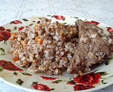 консервы мясные – 80 г, рис – 90 г, морковь – 15 г, лук репчатый – 10 г, масло растительное – 4 г, масло коровье – 15 г, вода – 333 г, соль, специи.
