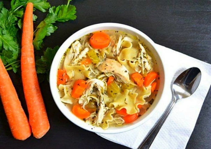 мясо птицы – 50 г, лапша – 37 г, масло растительное – 4 г, лук репчатый – 15 г, морковь – 15 г, сухая петрушка – 2 г, сухой тимьян – 1 г, соль, специи, вода – 400 г.