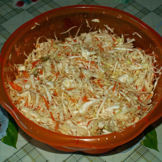 капуста белокочанная свежая – 125 г, морковь – 15 г, лук репчатый – 10 г, масло растительное – 8 г, уксус – 1 г, соль, сахар – 5 г, красный перец – 1 г.