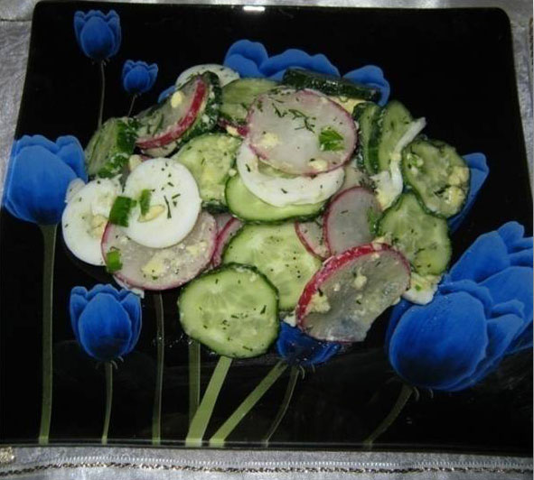редис – 60 г, огурцы свежие – 80 г, яйцо – 0,5 шт., уксус – 2 г, масло растительное – 10 г, зелёный лук – 5 г, укроп – 5 г, соль.