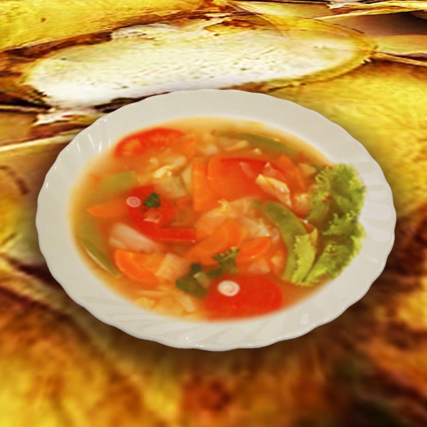 бульон – 450 г, картофель – 80 г, лук репчатый – 10 г, морковь – 10 г, перец болгарский – 20 г, помидоры – 50 г, капуста – 75 г, фасоль консервированная – 10 г, листья салата – 5 г, масло растительное – 4 г, соль, перец – по вкусу