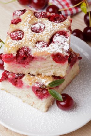 вишня – 50 г, крупа манная – 22 г, мука пшеничная 1 сорта – 30 г, вода – 50 г, сахар – 20 г, разрыхлитель – 1 г, корица – 1 г, соль – 1 г, масло растительное – 2 г, сахарная пудра – по вкусу
