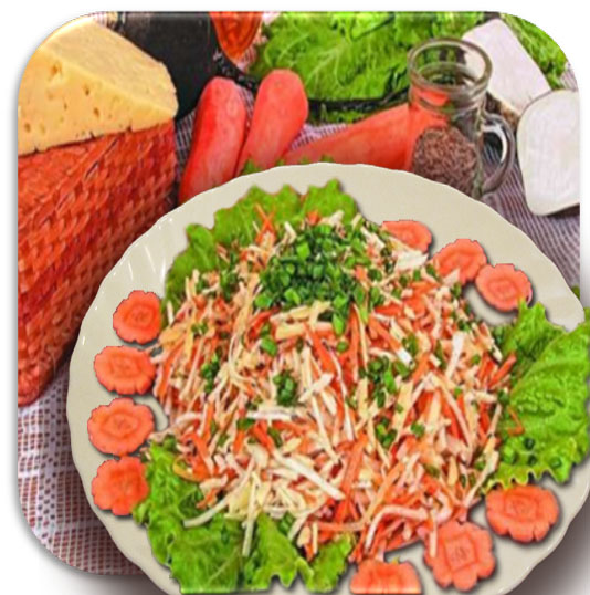 редька – 95 г, морковь – 20 г, лук зелёный – 15 г, салат – 20 г, сыр – 15 г, масло растительное – 8 г, соль, перец – по вкусу