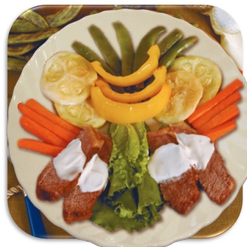 мясо – 100 г, кабачки – 150 г, болгарский перец – 50 г, морковь – 15 г, фасоль консервированная – 20 г, сметана – 10 г, уксус – 1 г, листья салата – 15 г, масло коровье – 5 г, масло растительное – 4 г, соль, перец – по вкусу