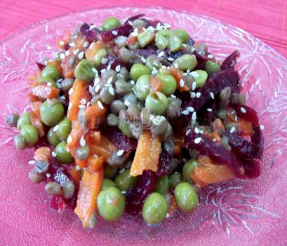 свёкла – 35 г, чечевица – 15 г, морковь – 15 г, консервированный зелёный горошек – 10 г, соль, масло растительное – 8 г, лимон – 5 г.