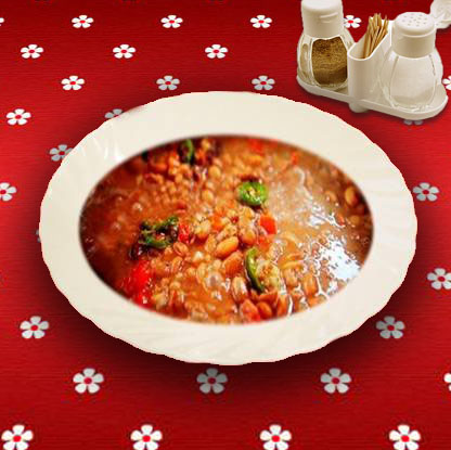 сухая белая фасоль – 40 г, свинина – 50 г, лук репчатый – 20 г, болгарский перец – 35 г, чеснок – 5 г, перец, соль, приправы, вода – 450 г.
