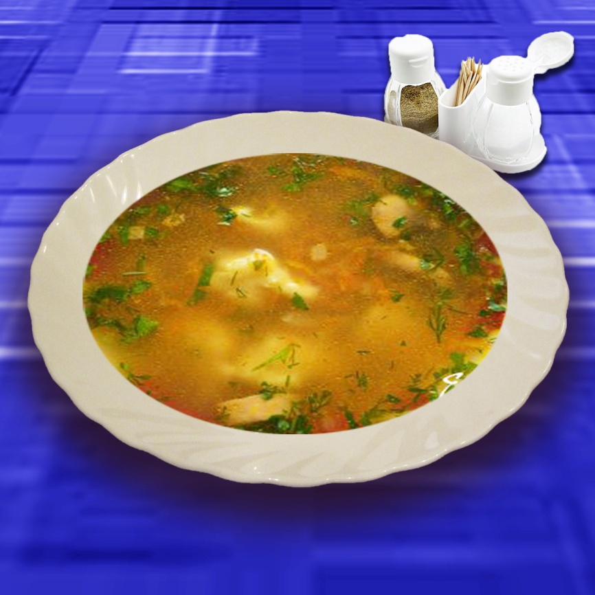 мясо птицы – 50 г, картофель – 55 г, лук репчатый – 15 г, морковь – 15 г, помидор свежий – 10 г, вермишель – 30 г, вода – 400 г, зелень петрушки – 5 г, соль, перец.