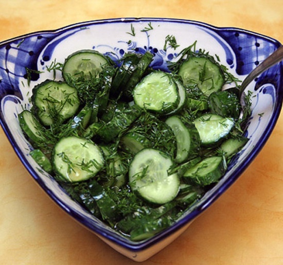 огурец свежий – 145 г, укроп – 5 г, лимон – 2 г, масло растительное – 8 г, соль.