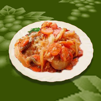 капуста белокочанная свежая – 125 г, морковь – 15 г, лук репчатый – 10 г, масло растительное – 8 г, уксус – 1 г, соль, сахар – 5 г, красный перец – 1 г.