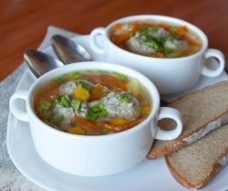 Пока варятся овощи, сделайте фрикадельки. Говядину измельчите и приготовьте фарш. Отварите рис до готовности, мелко нашинкуйте репчатый лук, добавьте яйцо. Посолите и поперчите по вкусу, перемешайте всё до однородной массы. Сформируйте фрикадельки и заложите их в кастрюлю с овощами. Как только фрикадельки всплывут, варите суп 5 – 7 мин (до готовности фрикаделек). Отключите нагрев и дайте супу настояться 10 мин. Подавайте суп со свежей зеленью.