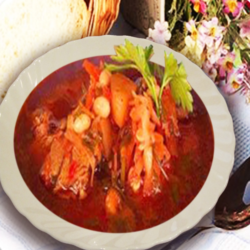 свёкла – 30 г, капуста белокочанная – 80 г, картофель – 85 г, лук репчатый – 10 г, фасоль красная – 10 г, морковь – 15 г, зелень – 5 г, томат-паста – 2 г, бульон – 450 г.