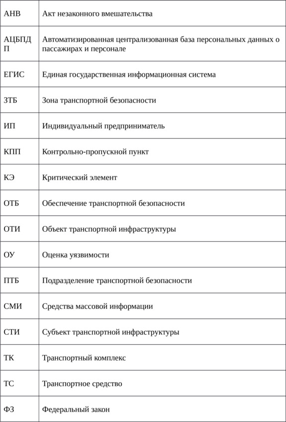 4) обеспечение транспортной безопасности (ОТБ) – реализация определяемой государством системы правовых, экономических, организационных и иных мер в сфере транспортного комплекса, соответствующих угрозам совершения АНВ;