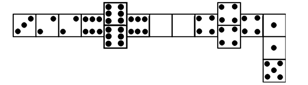 Ставя задачу, он сразу от примера с двумя косточками перескочил на четыре, пропустив случай с тремя косточками. Поэтому, лучше поздно, чем никогда, предлагаем решить аналогичную задачу для трех косточек. Выбрать из полного комплекта домино три косточки так, чтобы можно было получить все последовательные натуральные числа от 1 до максимально возможного без пропусков, складывая очки на соседних половинках. С другой стороны, задача допускает и дальнейшее обобщение: для 5, 6 и так далее косточек.