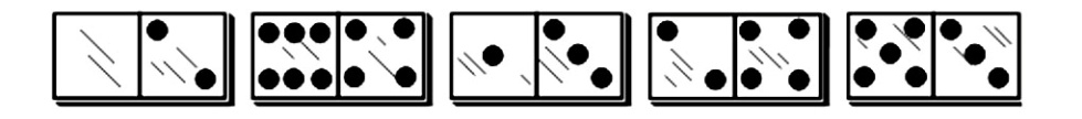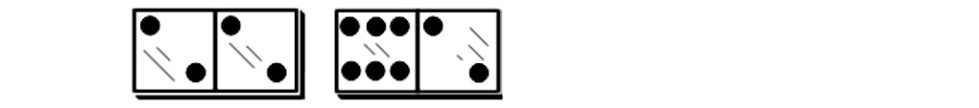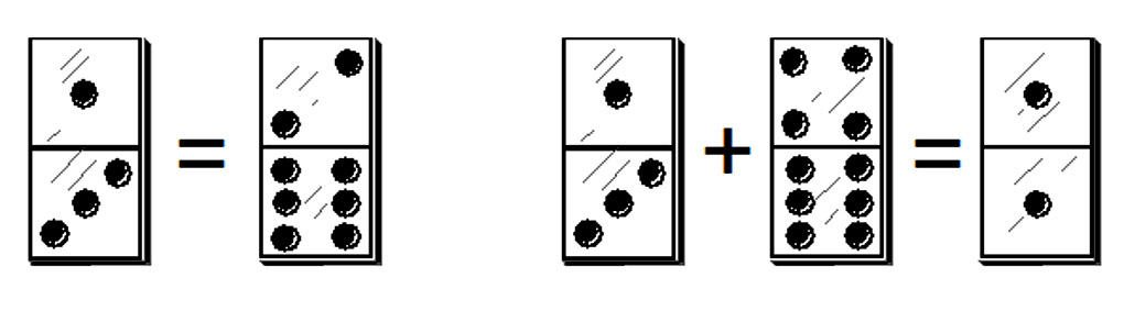 Сравнение. В детском домино с картинками ребенок сравнивает нарисованные образы, учится оперировать понятиями «разное» и «одинаковое». Играя в стандартное домино с очками, мы постоянно сравниваем очки на имеющихся у нас косточках, с очками на концах выложенной цепи. Если есть две кости, которые можно выложить в данный момент игры, выбираем лучший вариант, сравнивая суммы очков на них. Выполняя ранее приведенные упражнения, приходилось постоянно сравнивать очки на отдельных косточках, суммы очков в группах по четыре, по семь косточек, используя сравнительные понятия «равно», «больше», «меньше».