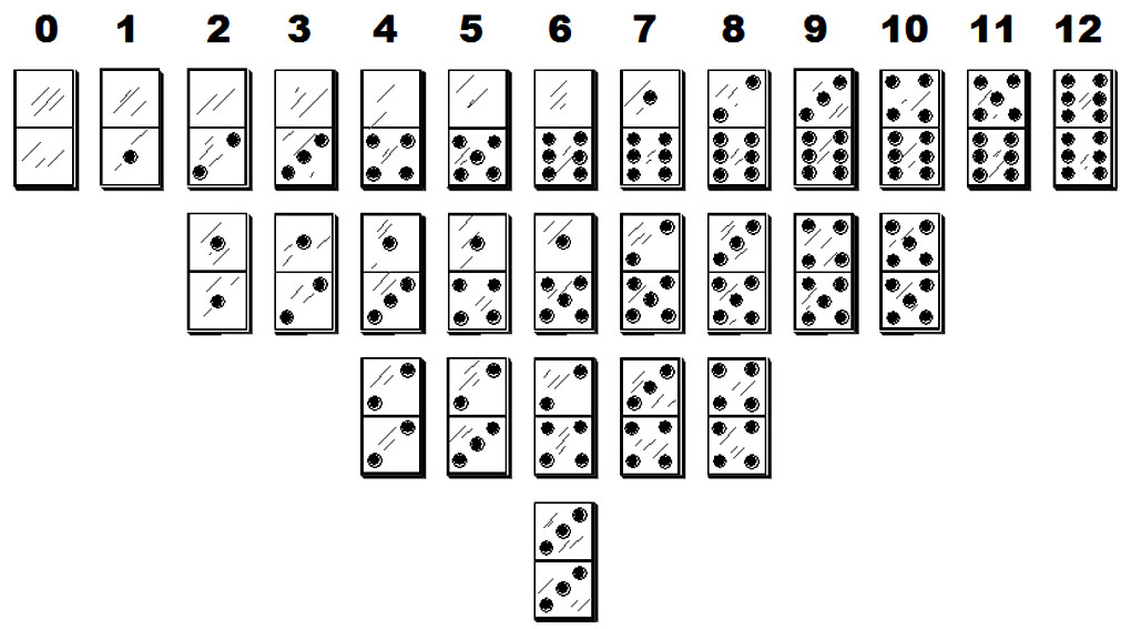 Для тренировки проведем классификацию косточек домино в зависимости от суммы очков на них. Кости распределятся на группы от нулевой суммы до, максимально возможной, равной 12. Количество косточек в группах меняется от одной до четырех.