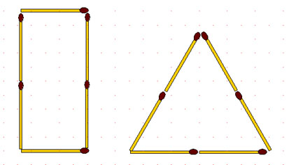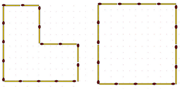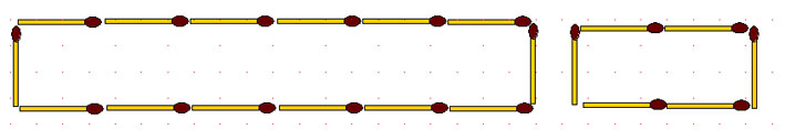Соотношение площадей фигур 1:3. Теперь возьмите 1 спичку в большей группе, переложите её в меньшую, и постройте новые фигуры с тем же соотношением площадей. Только сделайте это так, чтобы 12 спичек из первоначального расположения остались на своих местах.