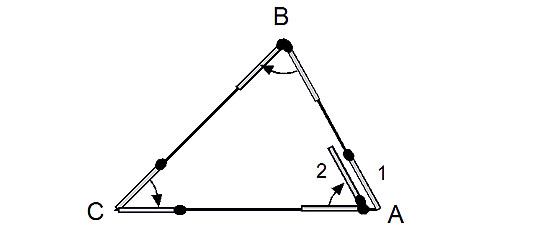 Далее, следуя рисунку, будем двигать спичку вдоль стороны, до тех пор, пока ее головка не совпадет с вершиной В. Теперь, поворачиваем спичку так, чтобы она описала угол В и расположилась вдоль другой стороны треугольника. Сдвинем теперь спичку вдоль второй стороны до следующей вершины С и поворачиваем спичку так, чтобы она описала угол С. Далее сдвинем спичку вдоль третьей стороны до исходной вершины А, поворачиваем спичку так, чтобы она описала угол А и вернулась в исходное положение, повернувшись при этом на все три угла треугольника, причем строго по часовой стрелке. В итоге она окажется совмещенной с первоначальной стороной треугольника, но ее головка «смотрит» в противоположное направление. Угол, описанный спичкой, равен сумме внутренних углов треугольника, а с другой стороны её суммарный поворот равен развернутому углу, то есть 1800. Этот метод доказательства называется «метод скользящей спички». Им можно воспользоваться для определения суммы внутренних углов четырехугольника, он служит удобным способом измерения углов любых многоугольников с любыми сложными самопересечениями.
