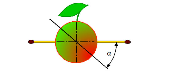 Если такое яблоко разрезать под некоторым углом α и поворачивать одну половинку относительно другой, то угол между спичками будет изменяться и за пол-оборота достигнет наименьшего значения (какого?).