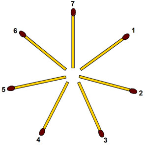 3-5. Семь спичек разложите на столе звездочкой, а ещё 6 спичек возьмите в руку. Начиная от любой спички, отсчитайте по часовой стрелке третью и рядом положите ещё одну спичку. Затем опять, начиная от любой спички, в том же направлении, отсчитайте третью спичку, против которой ещё не лежит дополнительная спичка, и также положите около неё ещё одну спичку. Действуя таким образом, постарайтесь разложить все 6 спичек, которые были у вас в руке. При отсчете спичек не следует пропускать и те, около которых уже положена спичка. Как решить задачу?