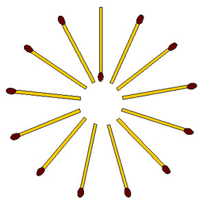 3-6. Тринадцать спичек расположены расходящимися лучами, как показано на рисунке, причем 12 из них направлены от центра и только одна – к центру. Требуется снять все спички, кроме той, которая обращена к центру, соблюдая следующее правило: сначала снять одну спичку, а затем, двигаясь по часовой стрелке, снимать каждую тринадцатую спичку. Сообразите, с какой спички нужно начать?
