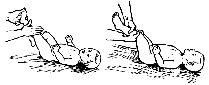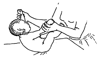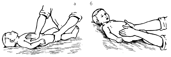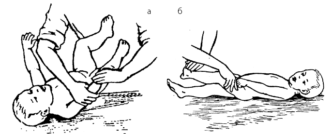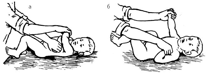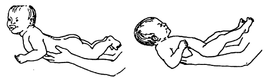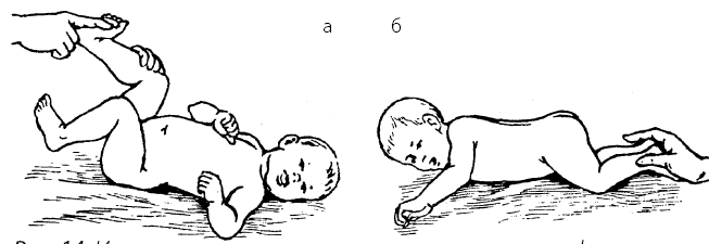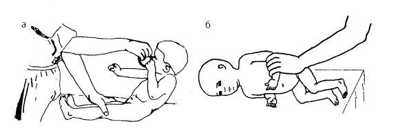 Рис. 15. Использование естественных возрастных рефлексов: а – рефлекторное разгибание позвоночника; 6 – хватательный рефлекс