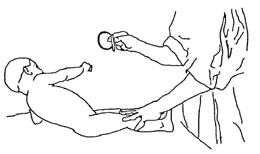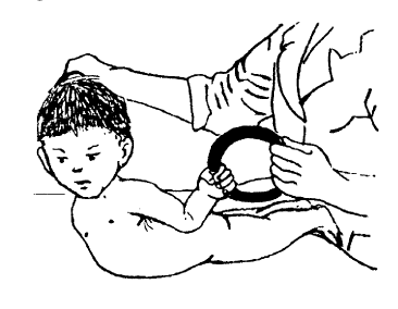 Еще одно из рефлекторных упражнений у детей раннего возраста – это рефлекс Робинсона: симметричный хватательный рефлекс. Если на ладонь новорожденного слегка надавить, возникает ответная реакция – рефлекторное сгибание пальцев и удержание (рис. 15, б). Естественно, при нарушении хватательного движения или при его асимметрии можно полагать о наличии пареза сгибателей пальца одной руки. Физиологический рефлекс Робинсона убывает с 4-го месяца жизни ребенка, а к концу года полностью исчезает.