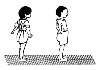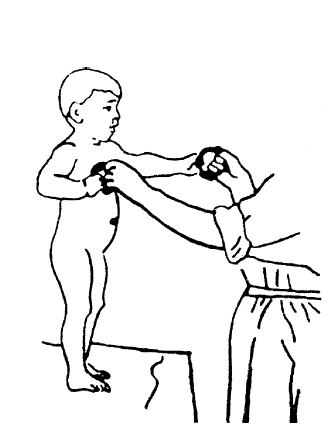 Постепенно можно переходить на присаживание за согнутые руки. В конце первого года жизни ребенка для развития мышц брюшного пресса, включают гимнастические упражнения на самостоятельное присаживание с фиксацией коленных суставов (рис. S). При нормальном развитии ребенка в этот период жизни осваивают наиболее сложные гимнастические упражнения, такие, как вставание с помощью рук. Упражнения проделывают с предметами, кольцами, игрушками, усложняя движения сгибанием и разгибанием рук («бокс»;рис. 9). Постепенно вводятся движения для развития верхних конечностей, такие как круговые вращения руками, поднятие рук вверх (вместе и поочередно), скрещивание их, усложняя эти движения одновременным захватом предметов (палочки). Подключаются команды «возьми игрушку» – наклоны туловища вперед (рис. 10), приседание. С детьми на 2-3-м году жизни проводят индивидуальные занятия, применяя ходьбу по доске, наклонной поверхности, гимнастической скамейке, используя ребристые поверхности для укрепления мышечного свода стопы (рис. 11).