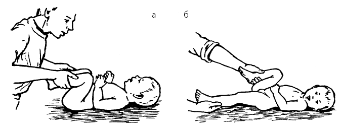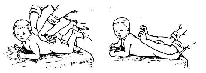Гимнастическое упражнение на рефлекторное ползание (рефлекс по Бауэру). Раздражая подошвы обеих стоп лежащего на животе ребенка, вызвать ползание. Ребенок, отталкиваясь от подпирающей ладони специалиста по массажу, проползает вперед по плоской, жесткой поверхности стола. Надо заметить, что данный рефлекс угасает у здоровых детей в возрасте 3–4 месяцев, а у недоношенных сохраняется до 5–6 месяцев (рис. 14, б).