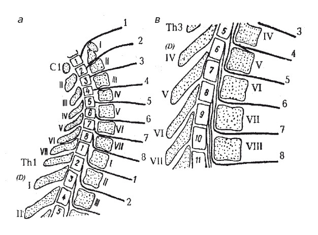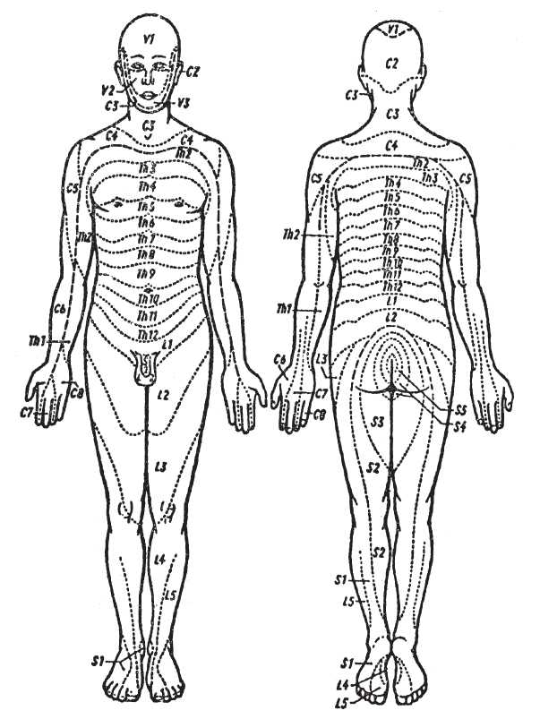 На ранних стадиях развития организм состоит из ряда одинаковых сегментов (метамеров). В последующем своем развитии каждый сегмент снабжается соответствующим спинномозговым нервом. Спинной мозг внешне приобретает сегментарное строение. Каждый спинномозговой нерв иннервирует участок кожи соответствующего сегмента (дерматома). Дерматомы представляют собой кожные зоны в виде пояса или полос, охватывающих тело от средней линии сзади до средней линии спереди. Переход на противоположную сторону наблюдается только у крестцовых дерматомов. Такая симметрия обусловлена эмбриологически. Связь сегмент – спинномозговой нерв – дерматом устанавливается рано и остается неизменной. Раздражение от внутренних органов передается через симпатические, парасимпатические и диафрагмальные нервы. Зоны обозначают по тем спинномозговым сегментам, которые их иннервируют. Поэтому соответственно выходу нервов различают следующие сегменты спинного мозга (рис. 1): 8 шейных (С1 – С8); 12 грудных (D1 – D12); 5 поясничных (L1 – L5); 5 крестцовых (81 – 85).