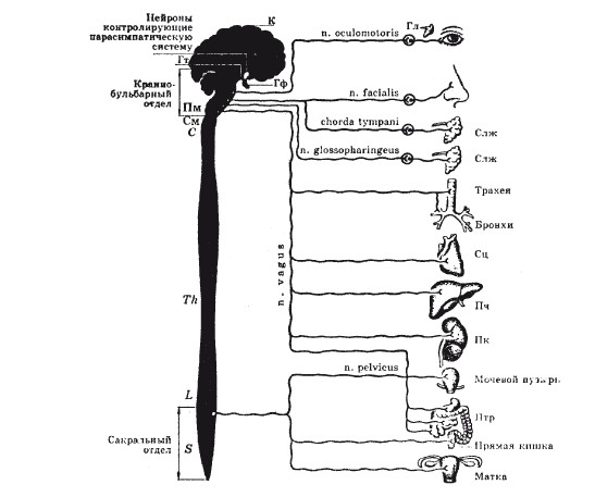 Рис. 2. Вегетативная нервная система (общий план строения):а—симпатическая система; б – парасимпатическая система