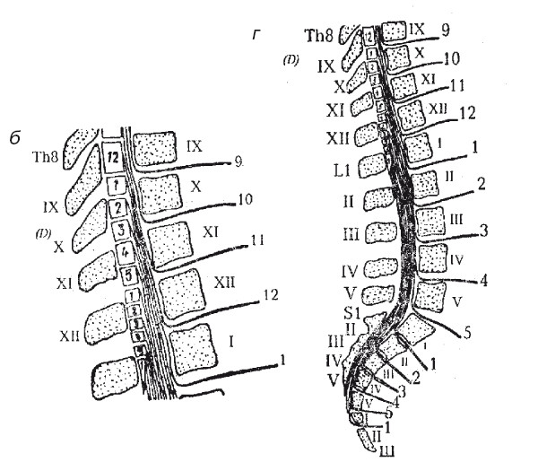 Рис. 3. Задние ветви спинномозговых нервов: а – шейный отдел; б – нижний грудной отдел; в – верхний грудной отдел; г – пояснично-крестцовый отдел