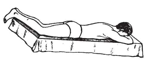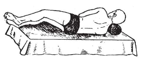 Поза лежа на левом (правом) боку, левая (правая) нижняя конечность полусогнута в коленном суставе, правая (левая) нога выпрямлена, левая (правая) рука согнута в локтевом суставе, массаж проводится как спереди, так и со стороны спины лежащего на соответствующем боку пациента (рис. 5).